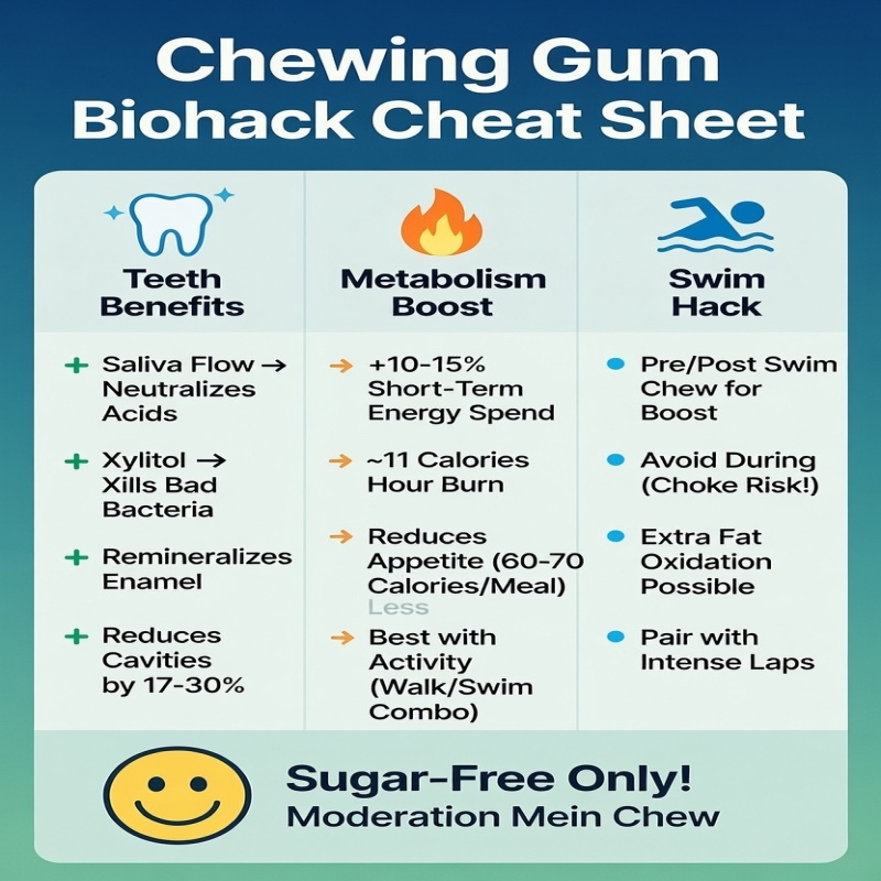 Toh summary mein: Sugar-free chewing gum teeth ka best friend hai – cavities kam, fresh breath, stronger enamel. Metabolism pe thoda boost deta hai (small but consistent), especially activities ke saath. Swim mein direct nahi, but pre/post perfect hack.