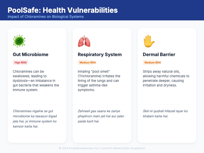 Chlorine + sweat/pee = harmful chemicals jo inhale ya swallow hote hain.